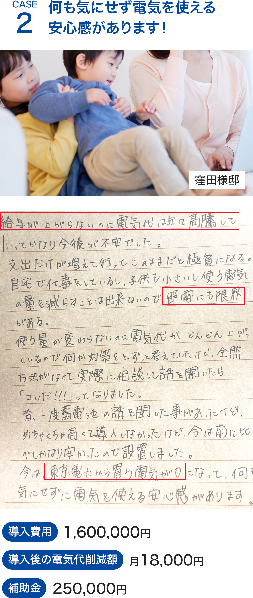 契約後1ヶ月程度で工事開始、工事自体は1日~2日で終わりますので最短で2ヵ月後には電気代が節約できたことが実感できます。