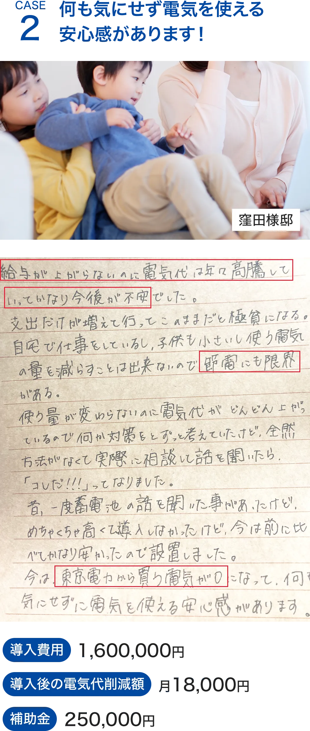 契約後1ヶ月程度で工事開始、工事自体は1日~2日で終わりますので最短で2ヵ月後には電気代が節約できたことが実感できます。